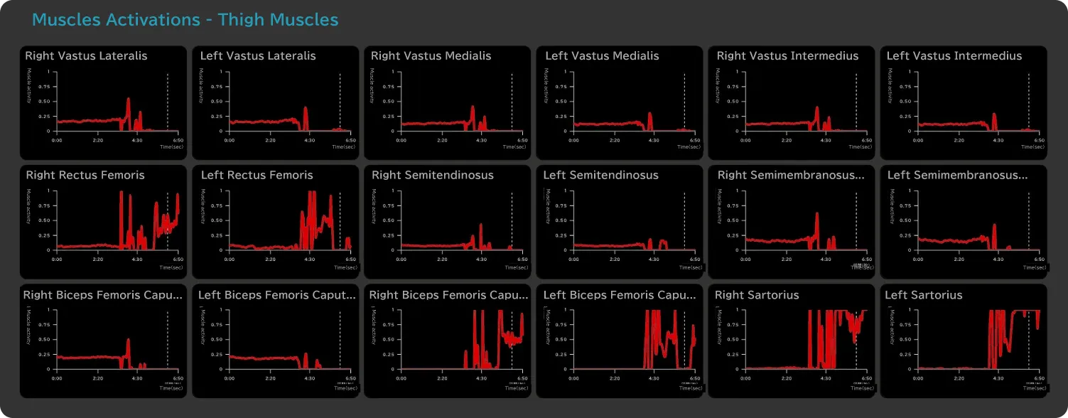 The 3D animation generated from posture estimation can be overlaid with ground reaction forces, muscle activity levels, and center of mass data. Additionally, synchronized graphs of each dataset can be displayed simultaneously. All data can be selected and output by individual joint segments.