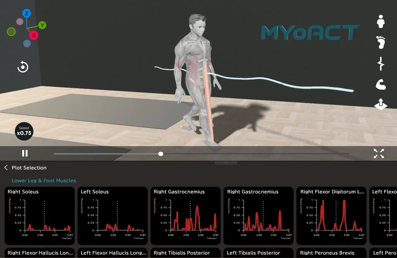 With just a single-angle video, MyoAct can generate a 3D animation of a person’s posture. What once required expensive motion capture systems or multiple cameras can now be done effortlessly, allowing you to view and assess posture freely from any angle.
