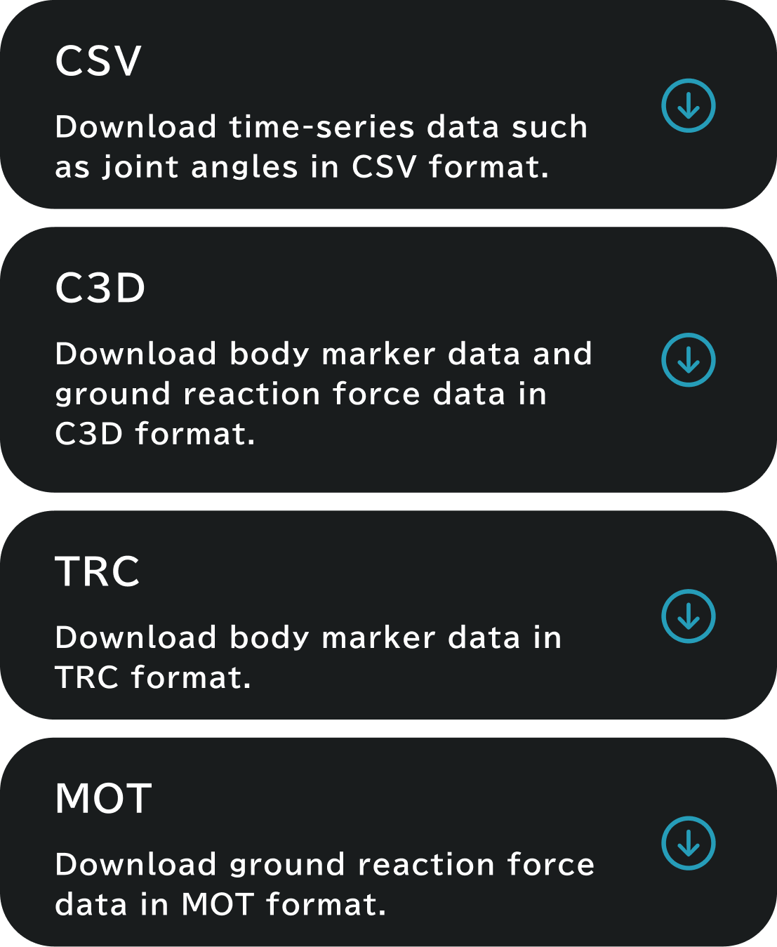 You can download surface marker and ground reaction force data in formats compatible with traditional motion capture systems. All time-series data from motion analysis can be exported as CSV files, making it easy to use for research and performance evaluation purposes.